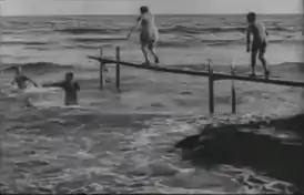 В фильме показаны мостки, с которых купальщики прыгают в прибой.
