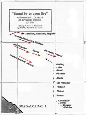- Morison, Struggle for Guadalcanal, с. 234; Hammel, Guadalcanal: Decision at Sea, с. 349—350, 415. Полный состав японской эскадры перед сражением: линкор Кирисима, тяжёлые крейсера Атаго и Такао, лёгкие крейсера Нагара и Сэндай, эсминцы Хацудзуки, Асагумо, Тэрудзуки, Сираюки, Инадзума, Самидарэ, Сикинами, Уранами и Аянами. Контр-адмирал Синтаро Хасимото командовал 3-й эскадрой миноносцев, включавшей Уринами, Сикинами и Аянами с Сэндай.