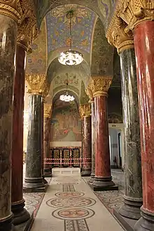 - Западный центральный портал украшен мозаичными изображениями Спаса Нерукотворного, двумя сюжетами из жизни святителя Николая Чудотворца, символами евангелистов и орнаментами.