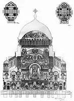 Роспись была только в алтаре, парусах и на сводах северных и южных хор работы художника М. М. Васильева. Рисунок был выполнен частично под мозаику, частично под фрески. При реставрации храма было решено закончить роспись[18].