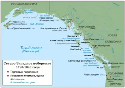 Российская империя продвигалась к северо-западному побережью — за залив Принца Вильгема — медленными темпами, из-за нехватки кораблей и моряков. Русские достигли залива Якутат в 1794 году, а в 1795 году они построили там поселение Новороссийск (Славороссия), которое должно было стать колониальным центром.[64] Разведкой побережья вплоть до островов Королевы Шарлотты занимался англичанин Джеймс Шилдс — служащий компании Голикова-Шелихова. В 1795 году Александр Баранов зашёл в залив Ситка и провозгласил его частью России. Группы промышленников прибыли сюда в следующем году. К 1800 году три четверти всех выделанных шкурок калана Российско-американской компании добывались на территории вокруг залива Ситка (несколько тысяч в год). В заливе Ситка также впервые возникла серьёзная конкуренция между русскими, англичанами и американцами.[65]