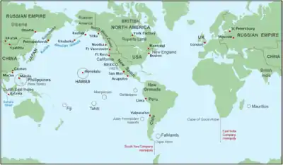 С 1779 по 1821 год две английские промысловые компании мехом — монреальская Северо-Западная компания и лондонская Компания Гудзонова залива — соперничали за контроль над промыслом пушнины на территории нынешней западной Канады.[89] Борьба, которая в итоге вылилась в ряд вооружённых противостояний, в основном велась за земли Руперта, лежавшие к востоку от континентального перевала.[89] На рубеже XVIII и XIX столетий Северо-западная компания расширила сферу своей деятельности на запад, в самую неизведанную часть северо-запада Тихого океана.[89] К 10-м годам компания организовала пушной промысел к западу от Скалистых гор — в Новой Каледонии и Колумбии.[90] Начиная с 1811 года американская Тихоокеанская меховая компания вела соперничество с Северо-западной компанией в этом регионе, но во время Англо-американской войны Тихоокеанская компания, опасаясь захвата со стороны Английского флота, продала все свои активы Северо-западной компании.[90] Американская компания построила в устье реки Колумбия форт Астория. Северо-западная компания его переименовала в форт Джордж и он стал тихоокеанским портом округа Колумбия.[90] Северо-западная компания хотела наладить с Китаем торговлю шкурами бобра. Поскольку Ост-Индская компания контролировала английскую торговлю в Кантоне, Северо-западная компания обратилась к американским судоходным компаниям. С 1792 года американские фирмы начали поставляли её пушнину в Китай. Купив в 1815 году форт Джордж (Астория), Северо-западная компания начала вести поставки в округ Колумбия через бостонскую фирму «Перкинс и компания». Американские корабли, прибыв в форт Джордж, забирали бобровую пушнину Северо-западной компании в Кантон, где она обменивалась на китайские товары, которые после этого перевозились в Бостон на продажу. Несмотря на то, что «Перкинс и компания» брала 25 % с выручки, данная схема всё равно была вполовину прибыльней, чем если бы английские корабли доставляли пушнину в Кантон через Ост-Индскую компанию за векселя, а потом возвращались из Китая пустыми.[34]