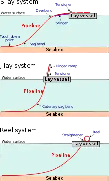 Существует четыре основные системы укладки трубопровода: с буксировкой плетей, укладка по S-образной кривой, укладка по J-образной кривой, укладка с барабана.
