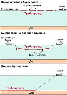 При применении этого способа трубы сваривают в длинные плети на суше, а потом буксируют к месту укладки морскими буксирами. Сборка плетей может осуществляться как параллельно, так и перпендикулярно береговой линии. Существенным преимуществом системы буксировки плетей является то , что предварительное тестирование и осмотр линии происходят на суше, а не в море. Существуют четыре различные технологии сооружения трубопровода с помощью буксировки[8]: