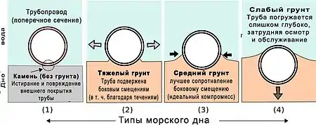 Вторым важным параметром является механические свойства грунта. Если несущая способность грунта слабая, трубопровод может заглубиться в него так, что осуществление инспекций, технического обслуживания и предполагаемых врезок будет затруднено или невозможно. С другой стороны, в скалистом морском дне тяжело прокладывать траншею для укладки трубопровода, а так же оно может повредить внешнее покрытие трубы. (Необходимость укладки трубопровода в траншею может быть вызвана рядом причин, например, экзарцией дна морскими льдами).