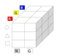 Возможные сочетания: А1, Б3, В2, или А1, Б2, В3, или А2, Б1, В2 и т. д. Общее количество сочетаний в морфологическом ящике равно произведению чисел элементов на осях. В нашем примере: 4*5*3 = 60.