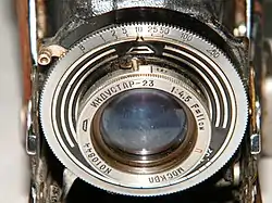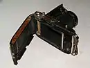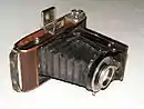 - Корпус складной, после откидывания передней панели автоматически выдвигался мех с оправой объектива и центральным затвором.