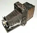 - Корпус складной, после откидывания передней панели автоматически выдвигался мех с оправой объектива и центральным затвором.