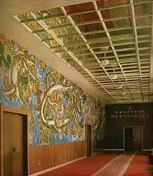 В большом вестибюле имелись бесшумные, скоростные лифты и парадная лестница, соединявшаяся с жилыми помещениями гостиницы. Раскрывавшееся во внутренний дворик фойе гостиницы было украшено росписью народного художника Азербайджана Тогрула Нариманбекова. Из фойе можно было пройти к ресторанному и банкетным залам[3].