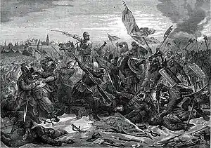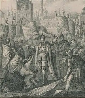 ![]() Б. А. Чориков. «Великий князь Дмитрий Пожарский освобождает Москву» (илл. к книге «Живописный Карамзин», 1836). | |||