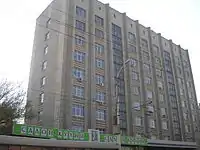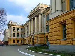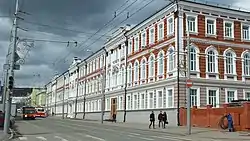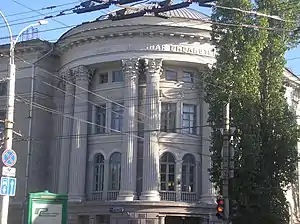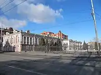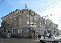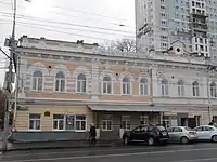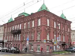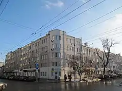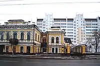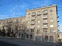 Жилой дом на месте Вознесенско-Горянской (Михаило-Архангельской) церкви. Филиал Областной универсальной научной библиотеки. Построен в 1939, отделка завершена в 1950 г. Арх. Д. В. Карпов. |