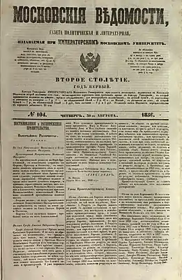 ![]() Титульный лист газеты «Московские ведомости» № 104 за 30 августа 1856 года, где, в частности, приведён рескрипт Александра II о награждении московского митрополита Филарета усыпанным бриллиантами посохом за его неустанные труды на благо церкви | |