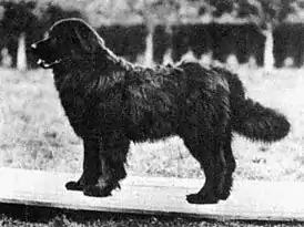 Собака имела несколько растянутый формат, грубую конституцию с мощным костяком и сильно развитой мускулатурой. Голова с широким массивным черепом, короткой тупой мордой, висячими треугольными ушами. Шерсть длинная, прямая или чуть волнистая, чёрная или чёрная с красноватым отливом, допускались небольшие белые пятна на груди и лапах. Требовалось, чтобы рост кобелей был не ниже 66 см, сук — не ниже 63 см[9].