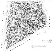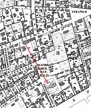 ![]() Арбатская часть (лист 2) из «Атласа столичного города Москвы» А. Хотева (1852—1853) | ![]() Фрагмент плана А. Хотева (стрелка соответствует направлению взгляда) | ![]() Сопоставление вида московского дворика с картины Поленова и плана А. Хотева 1852—1853 годов (ориентация карты определяется стрелкой в левом нижнем углу) |