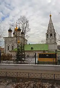 За двориком и прилегающими к нему строениями находится белая пятиглавая церковь с колокольней шатрового типа (с конусообразным верхом) — храм Спаса Преображения на Песках[73][74], построенный около 1711 года и сохранившийся до нашего времени[75]. В правой части полотна видны очертания другого храма с колокольней — церкви Николая Чудотворца в Плотниках[5]. Эта церковь, построенная в 1691 году, находилась на Арбате, у пересечения с Никольским (с 1922 года — Плотниковым) переулком. Она была снесена в 1932 году[76]. Правее неё едва видны купола ещё одной церкви, расположенной в Пречистенской части Москвы[5].