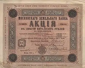 Среди десятка земельных банков, возникших в Российской империи в 1871—1873 годах в ходе осуществления кредитной реформы после отмены императором Александром II крепостного права и просуществовавших вплоть до Октябрьской революции (переворота), был и Московский земельный банк. В их число входили так же Донской, Харьковский, Полтавский, С.-Петербургско-Тульский, Киевский, Бессарабско-Таврический, Нижегородско-Самарский, Виленский и Ярославско-Костромской земельные банки. Складочный капитал этих кредитно-финансовых учреждений на 1 июля 1898 года составлял 51 716 520 рублей[4].