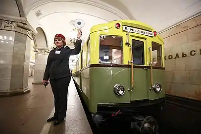 4 февраля 1935 года прошёл первый пробный поезд[33], а 6 февраля 1935 года Московский метрополитен сдали в эксплуатацию. Машинистом электропоезда с руководителями партии и правительства был Николай Алексеевич Крейцберг, ветеран гражданской войны, ранее участвовавший в пуске первых троллейбусов в Москве (в 1936 году был арестован органами НКВД как враг народа)[34]. Для рядовых москвичей метрополитен открыли 15 мая 1935 года.