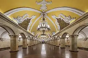 Первая линия — Сокольническая — торжественно открылась 15 мая 1935 года; в момент запуска насчитывала 13 станций, имела длину 11,2 км и шла от станции «Сокольники» до станции «Охотный Ряд» с вилочным ответвлением на «Парк культуры» и «Смоленскую»[4][5]. На 2021 год метро состоит из 14 линий общей длиной 438,6 км в двухпутном исчислении без учёта монорельса и МЦК. Сейчас в Московском метрополитене 250 станций, из которых 3 реконструируются («Рижская», «Варшавская», «Каширская»); к 2010 году 44 станции признаны объектами культурного наследия[6], а более 40 являются памятниками архитектуры[7].