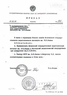 1 августа 1990 года Московский государственный педагогический институт им. В. И. Ленина был преобразован в педагогический университет им. В. И. Ленина (Приказ ГК СССР по народному образованию № 543 от 01.08.1990 г.).