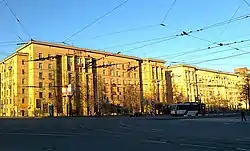 На углу с Бассейной находится «Генеральский дом» — башня со шпилем [18] (д. 190/41). Здание планировали построить в 1940—1941 годах по проекту архитекторов Б. Р. Рубаненко, Г. А. Симонова, О. И. Гурьева, С. В. Васильковского и Л. М. Хидкеля и до войны был завершен основной корпус со стороны Московского проспекта. Башня на углу Бассейной была построена уже после войны. В этом доме проходило детство музыканта Виктора Цоя[19] и философа Михаила Попова.