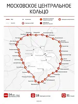 Московское центральное кольцо (МЦК) — маршрутная линия железнодорожного[10][11] пассажирского транспорта в Москве[12][13], частично интегрированная с метрополитеном по системе оплаты проезда и пересадкам[14]. Представляет собой городскую систему движения электропоездов[15] по основному ходу[16] Малого кольца Московской железной дороги (МК МЖД). РЖД осуществляет перевозки по договору с заказчиком проекта — Московским метрополитеном[17].