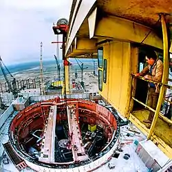 - Подъёмно-транспортные и строительно-монтажные операции в период строительства АЭС: операции по складированию оборудования (частей реактора, корпусов парогенераторов, компенсатора, главных циркуляционных трубопроводов и насосов и др.), а затем их установке на проектное место[3].