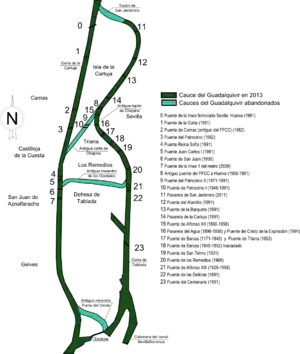 Река Гвадалквивир, которая пересекает Севилью с севера на юг, претерпела многочисленные изменения в своем течении на протяжении всей истории, особенно в течение XX века. Эти изменения повлияли на строительство и расположение мостов, которые пересекают город. В начале ХХ века река Гвадалквивир входила в город с севера и пересекла Севилью, чтобы покинуть город с юга, с выраженным меандром, который затруднил речной трафик из Атлантического океана.