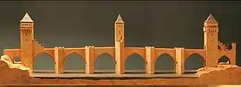 Конструкция моста включает три оборонные башни, одна из которых возведена над средней опорой и две на устоях[67]. Высота башен, снабжённых навесными бойницами, — около 40 м; верхний ярус зубцов венчает остроконечная кровля[25][68][60]. Боковые башни почти квадратные в плане; центральная представляет собой чуть более вытянутый прямоугольник[68]. Каждая имеет три этажа; переходы между башнями дополнительно защищались створчатыми воротами и опускными решётками[29][69]. Предполагается, что центральная башня, отличающаяся меньшей толщиной стен и не имеющая машикулей, использовалась в первую очередь как наблюдательный и командный пункт, однако прямых подтверждений этому нет[70][71].