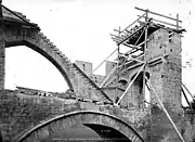 В ходе реставрации водопроводные трубы были скрыты бетоном, в связи с чем пришлось несколько поднять парапет[13]. Тщательно изучив все детали и архитектурные особенности постройки, Поль Гу восстановил утраченные элементы и устранил более поздние, не относящиеся к XIV веку[13][35]. Морис Селлес, отдавая должное его добросовестности, замечает тем не менее, что Гу не смог устоять перед искушением придать мосту завершённый, на его взгляд, облик. Так, он добавил на западной башне верхний ярус зубцов (объясняя это как следованием обнаруженным при исследованиях пометам строителей, так и тем, что «снаружи этого требовал глаз, а изнутри — соображения фортификации») и снабдил мост многочисленными мерлонами и бойницами[13][36]. К 1882 году работы были завершены[12].