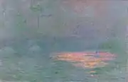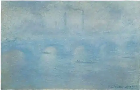 | Мост Ватерлоо, солнце в тумане, фр. Waterloo Bridge, le soleil dans le brouillard. 73 × 92 см. Справа внизу подпись и дата: Claude Monet 1904. Частная коллекция. | В марте 1913 года выкуплена у Моне Полем Дюран-Рюэлем и в том же году продана Артуру Б. Эммонсу из Ньюпорта, США. 14—15 января 1920 года выставлена на распродажу собрания Эммонса в отеле «Плаза», Нью-Йорк. Далее картина находилась в галерее Питера Финдли в Нью-Йорке и затем в галерее «Лефевр» в Лондоне, откуда была продана в частную коллекцию[27]. |
