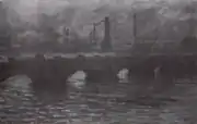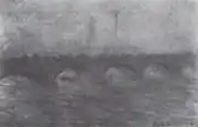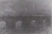 | Мост Ватерлоо, пасмурная погода, фр. Waterloo Bridge, temps gris. 65 × 100 см. Слева внизу подпись и дата: Claude Monet 1903. Национальная галерея искусства, Вашингтон, США. Инв. № 1963.10.183[25]. | В мае 1904 года выкуплена у Моне Полем Дюран-Рюэлем и в июле 1905 года продана Франклину Ф. Никола из Питтсбурга. Далее картина принадлежала Честеру Дэйлу и по его завещанию в 1963 году поступила в Национальную галерею искусства в Вашингтоне[24]. |