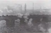 | Мост Ватерлоо, эффект дымки, фр. Waterloo Bridge, effet de brume. 65 × 100 см. Справа внизу подпись и дата: Claude Monet 1904. Частная коллекция, США. | В октябре 1905 года выкуплена у Моне Полем Дюран-Рюэлем и в том же году продана им А. Стерну. В апреле 1919 года обратно выкуплена Дюран-Рюэлем и в июне того же года продана Адольфу Левисону из Нью-Йорка. 16—17 мая 1939 года выставлена на распродажу собрания Левисона в аукционном доме «Парк Бернет». В 1941 году выставлена в галерее «Недлер», затем находилась в мемориальном художественном музее Д. Р. Аллена в Оберлине, Огайо, США. В 1948 году вновь выставлена на продажу в «Недлере». С 1982 года в частной коллекции в США[38]. |