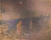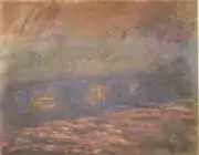 | Мост Ватерлоо, туманное солнце, фр. Waterloo Bridge, soleil voilé. 65 × 100 см. Слева внизу подпись и дата: Claude Monet 1903. Частная коллекция, США. | В июне 1904 года выкуплена у Моне Полем Дюран-Рюэлем и в ноябре продана в берлинскую галерею Пауля Кассирера, около 1916 года выставлялась в галерее Бошвица в Берлине[53] и вскоре оказалась в собрании Пауля Оппенхайма и его жены Габриэль Эррера. В 1933 году они эмигрировали из Франкфурта в Брюссель, а в 1939 году бежали от фашистов в США, свою коллекцию импрессионистов они спрятали в банковских хранилищах по подложным документам на имя своих друзей. По окончании Второй мировой войны они сумели быстро вернуть всё своё собрание, картина была вывезена в США и хранилась в семейном собрании Оппенхаймов-Эррера вплоть 1991 года, когда была передана на хранение в Художественный музей Принстонского университета. После смерти Габриель Оппенхайм-Эррера, последовавшей в 1997 году, картина была выставлена на торги в аукционном доме «Кристис», прошедшие 11 ноября 1997 года; продана за 8,25 млн долларов[54], новым владельцем стал нью-йоркский галерист и коллекционер Дэвид Нэш[55]. |