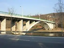 В 1896 году немного выше по течению был построен трехпролетный стальной мост (42 + 62,6 + 42 м). В 1961—1964 гг. он был заменен существующим железобетонным мостом. Мост сооружен компанией «Stavby silnic a železnic» по проекту инженера Й. Тврзника (чеш. J. Tvrzník). Особенностью данного моста стало применение безопалубочного метода бетонирования пролетного строения[1]. В 1997 г. произведен ремонт моста.