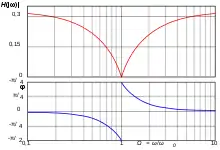 Здесь обозначено — нормированная безразмерная частота, — постоянная времени RC-цепи, — частота максимума модуля передаточной функции.