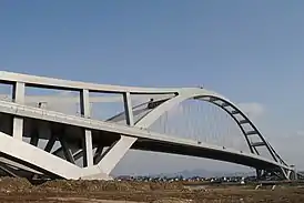 Длина — 1 330 м. Мост представлен однопролётной арочной конструкцией с дорожным полотном посередине и мостовыми подходами (эстакады). Длина основного пролёта — 450 м, дополнительные два по 100 м. Арочная конструкция сплошностенчатая (по принципу балочных конструкций) и выполнена из стали. Конструкция имеет по три поперечные связи (вертикальные опоры) с двух сторон между дополнительными продольными балками (от основного пролёта) и арочным сводом. Дорога моста крепится на тросах арки.