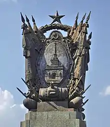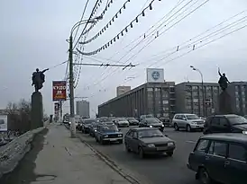 В северной части моста на высоких постаментах расположены статуи воинов — мужчины и женщины. Скульптор Николай Томский особое значение придавал их силуэтам. Согласно его замыслу, именно выразительные силуэты скульптур должны были создавать атмосферу напряжённости и тревоги, характерную для осени 1941 года[2].