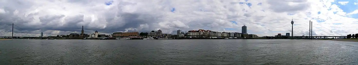 - На правом берегу Рейна в непосредственной близости от моста Rheinkniebrücke находятся здание ландтага Северного Рейна-Вестфалии и телевизионная башня Rheinturm;