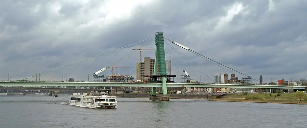 Решение о строительстве моста было принято кёльнским городским советом в 1956 году. На конкурс было представлено 39 проектов, среди которых были стальные и сталежелезобетонные балочные неразрезные сплошные пролетные строения с главными пролетами величиной от 196 до 238 м. Для строительства был выбран вариант с коробчатым комбинированным с вантами стальным пролетным строением и стальной ортотропной плитой со средним пролетом 301 м[2]. Проект разработал архитектор Герд Ломер и компания Gutehoffnungshütte Sterkrade AG, инженером-консультантом был Фриц Леонгард[3][4].