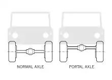 - Портальный мост - для увеличения[3] или уменьшения[4] дорожного просвета и разгрузки главной передачи. Так же называется П-образным или редукторным мостом. Крутящий момент в таких мостах передаётся от главной передачи к колёсам через дополнительные редукторы, расположенные в них (разнесённая двойная главная передача).