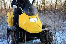 К передней части мотобуксировщика может быть пристыкован лыжный или колёсный (в бесснежное время года) модуль.