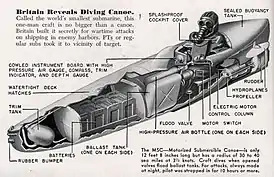 ![]() сверху - лодка в разрезе (Popular Science — март 1947) снизу - иллюстрация лодки под водой | |