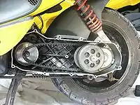 Первые мотороллеры имели обычную механическую коробку переключения передач и цепную передачу на заднее колесо. Сейчас почти всегда используются бесступенчатый клиноремённый вариатор и автоматическое центробежное сцепление. В наиболее дешёвых мотороллерах вместо вариатора в том же (внешне неразличимом) корпусе ставится простая цепная передача, что сильно ухудшает динамику.