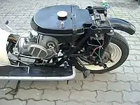 - Двигатель вместе с коробкой передач (с конца 1970-х годов — с вариатором) сблокирован с задним колесом и маятником.