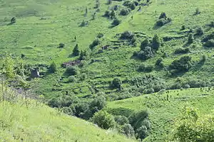 ![]() Общий вид на развалины аула Моцарой (на переднем плане кладбище) | |