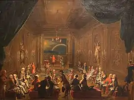 - It has further been suggested that Wolfgang Amadeus Mozart is represented on the far right, sitting next to his friend Emanuel Schikaneder. The fact that the two men wear a golden angle (an exclusive insignia of the chairman and the first supervisor) precludes this identification. For discussion of these errors see Michael Lorenz: «Neue Forschungsergebnisse zum Theater auf der Wieden und Emanuel Schikaneder», Wiener Geschichtsblätter, 4/2008, (Vienna: Verein für Geschichte der Stadt Wien, 2008), pp. 15-36
