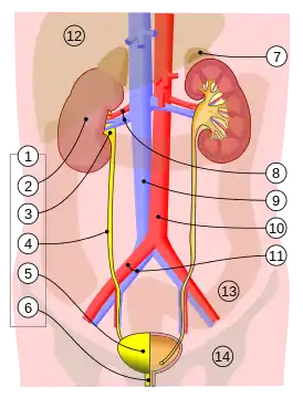 ![]() 1. Мочевыделительная система человека: 2. почка 3. почечная лоханка 4. мочеточник 5. мочевой пузырь 6. мочеиспускательный канал. | |