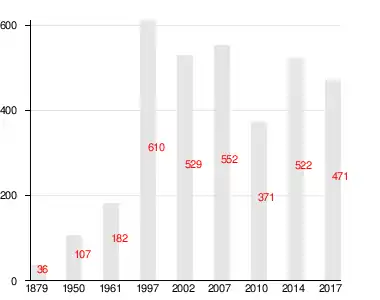 | 1879 | 1950 | 1997 | 2007[12] | 2010[13] | 2014[14] | 2017[15] |