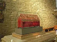 Служение литургии на гробах мучеников имеет такую же давнюю традицию, как и почитание самих останков. На Востоке после окончания гонений на христиан многие храмы строили непосредственно над гробницами христианских мучеников. На Западе Liber Pontificalis приписывает Феликсу указ в 269 году, что литургии надлежит проводить на могилах мучеников («Hic constituit supra memorias martyrum missas celebrare»)[109]. В 419 году Карфагенский собор в 94-м правиле постановил, чтобы если храм построен, но при нём нет мощей мучеников, то такой храм вместе с алтарём должен быть разрушен (если возможно, то местным епископом)[110]. Окончательно почитание святых мощей было закреплено Седьмым Вселенским собором, определившим, что епископ, который освятит храм без мощей, подлежит извержению из сана (7-е правило)[111][112]. Собор сделал также распоряжение положить мощи во все существующие храмы, в которых их ранее не было: «да будет совершено в них положение мощей с обычною молитвою'».
