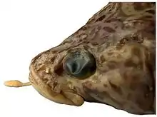 От двух других видов группы отличается следующим комплексом признаков. Подбородочный усик светлый, относительно толстый и короткий (10—12 % стандартной длины рыбы), при отгибании его назад поверх рыла (при закрытом рте) достигает переднего края ноздри. Терминальное расширение изменчиво в длину, составляет от трети до половины и более длины усика (30—60 %), булавовидное, более или менее округлое в поперечном сечении и лишь слегка сжатое дорсовентрально, относительно широкое (его ширина в 2—3 раза меньше прилегающей части стебля и 5—7 раз меньше, чем длина усика), состоит из толстых, узорчато-гофрированных, продольно ориентированных высоких складок, плотно прилегающих друг к другу. Стебель усика голый. Нижняя челюсть заметно или незначительно выдается вперед: при закрытом рте на её вершине могут быть видны все ряды зубов, кончик языка не виден. У вершины нижней челюсти 2—4 ряда зубов, у вершины верхней челюсти 2—3 ряда зубов. Посттемпоральные гребни хорошо выражены. Спинной плавник у самцов очень высокий (до 31 % стандартной длины), с ярко выраженной передней лопастью; у самок высота плавника заметно меньше (около 17—18 % стандартной длины) и без лопасти. Верх головы и передняя часть спины перед первым спинным плавником покрыты небольшими (примерно равными диаметру зрачка) округлыми, овальными или червеобразно вытянутыми тёмно-коричневыми пятнами; брюхо и грудь тёмные, низ головы и горло более светлые, без пятен. Второй спинной плавник у самцов тёмный, местами почти чёрный в передней части, тёмно-серый или пестроватый в задней половине и светлеющий к верхнему краю; у самок более пёстрый плавник. Анальный плавник тёмный у основания и светлый вдоль внешнего края. Грудные плавники светлые с тёмными вертикальными полосами. Хвостовой плавник серовато-чёрный или сероватый, с беловатыми краями и с контрастным тёмным Т-образным пятном в средней части, а иногда с узкими вертикальными тёмными полосами. Ротовая полость и перитонеум серые[1][8][2][5].
